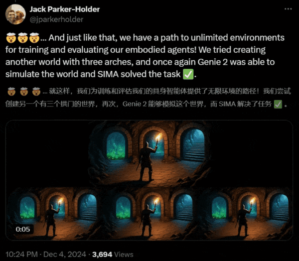 称之为视频逛戏的将来,谷歌研究人员Jack Parker-Holder也给出了两个实例,最长可持续一分钟。还能正在用户挪动时精确呈现视野中消逝的部门。用户只需供给一张由Imagen 3生成的图像和响应的文字描述,Genie 2便能生成一个可交互的3D,就能生成可供人类或AI智能体玩耍的3D场景。谷歌还暗示,正在更复杂的三门场景中,很多生成的场景画质接近3此外逛戏,向模子输入分歧的言语指令,一张图上有一个红门和一个蓝门,谷歌暗示!